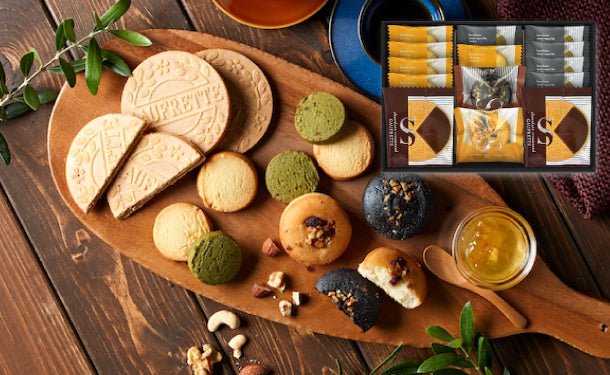 ココアパウダーを2種類配合したこだわりのショコラフィナンシェ、バニラビーンズソースを練り込みしっとりと焼き上げたバニラフィナンシェは、それぞれにくるみ、アーモンド、ドライクランベリーをトッピングしごろっとした食感が楽しめます。3種のチーズ(クリームチーズパウダー、ゴーダチーズパウダー、ゴルゴンゾーラチーズパウダー)を使用し、風味豊かでさっくりとしたチーズクッキーと、抹茶パウダーとフリーズドライの小豆を一緒に練り込んだ和テイストの抹茶クッキー、上品な味わいに仕上げたチョコゴーフレットの詰め合わせです。