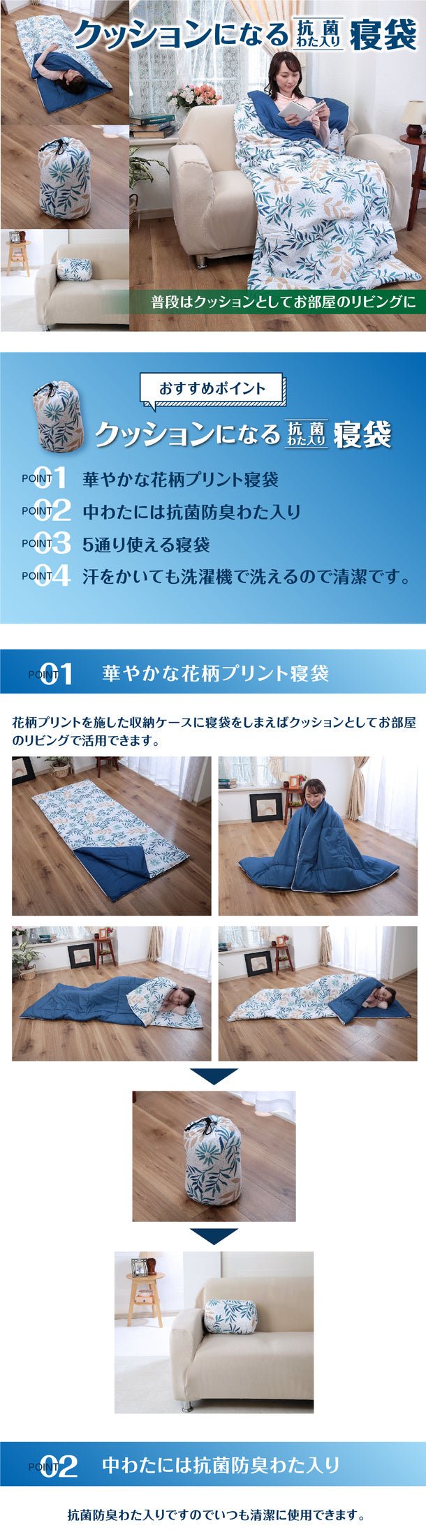「クッションになる抗菌わた入り寝袋」