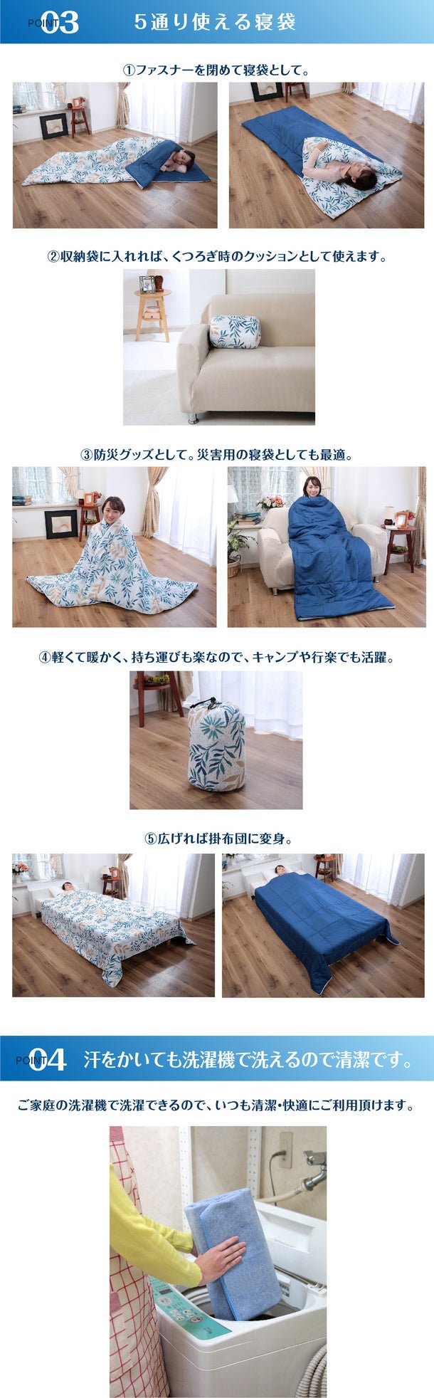 「クッションになる抗菌わた入り寝袋」