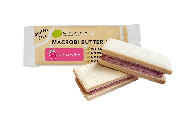 植物性の濃厚な「マクロビバター」にさわやかな甘みのストロベリーを、米粉と大豆粉を使用したグルテンフリーのクッキー生地にサンドしました。