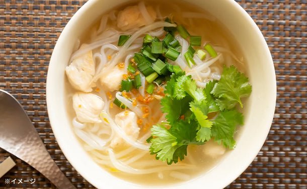 ツルっとした歯触りともちもちした食感のお米の平めん。あっさり鶏ガラスープに魚醤の旨味を効かせ、コリアンダーが優しく香るスープ。屋台の素朴な美味しさが楽しめます。