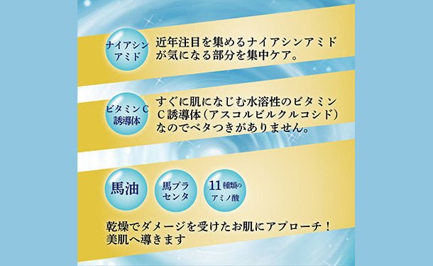 近年注目を集めているナイアシンアミドのしわ対策効果は高く、目元だけではなく、口元、額などの気になる部分を集中ケアし、しなやかでピンとした若々しさを与えてくれます。 すぐに肌になじむ水溶性のビタミンC誘導体(アスコルビルクルコシド)なのでベタつきがありません。
