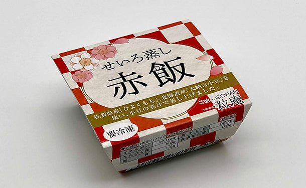 もち米(佐賀県産「ヒヨクモチ」)、大納言小豆(北海道産)、「一の塩」(唐津産)を素材とし、小豆の煮汁をかけながら蒸しあげた昔ながらの「赤飯おこわ」です。