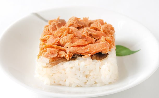 天然紅鮭のほぐし身としめじをトッピング。素材の味が活きた味わい深いおこわです。