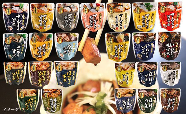 さんまの旨煮・さんまの味噌煮・さんまの黒酢煮・さんまの梅酢煮・さんまのゆず塩煮・さんまの生姜煮・さんまの旨辛煮・いわしの旨煮・いわしの味噌煮・いわしの生姜煮・さばの旨煮・さばの味噌煮・さばの水煮・ほたての旨煮・ほたての水煮・ほたてのバター醤油・ほたてのバジル・ほっけの旨煮・ほっけの味噌煮・ほっけの水煮・ほっけのバジル・まる煮あなご・まるあなごの蒲焼き風・こまいの旨煮