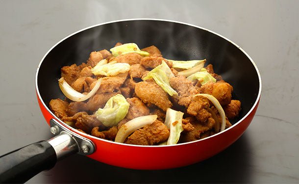 国産鶏肉をこだわりの自社製たれで味付けした 「ケーちゃん」と野菜を一緒に炒める簡単料理です。