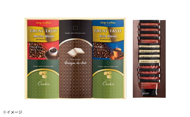 口触りの良いラングドシャとバニラクッキー、ドリップコーヒーを組み合わせたセット。
