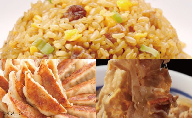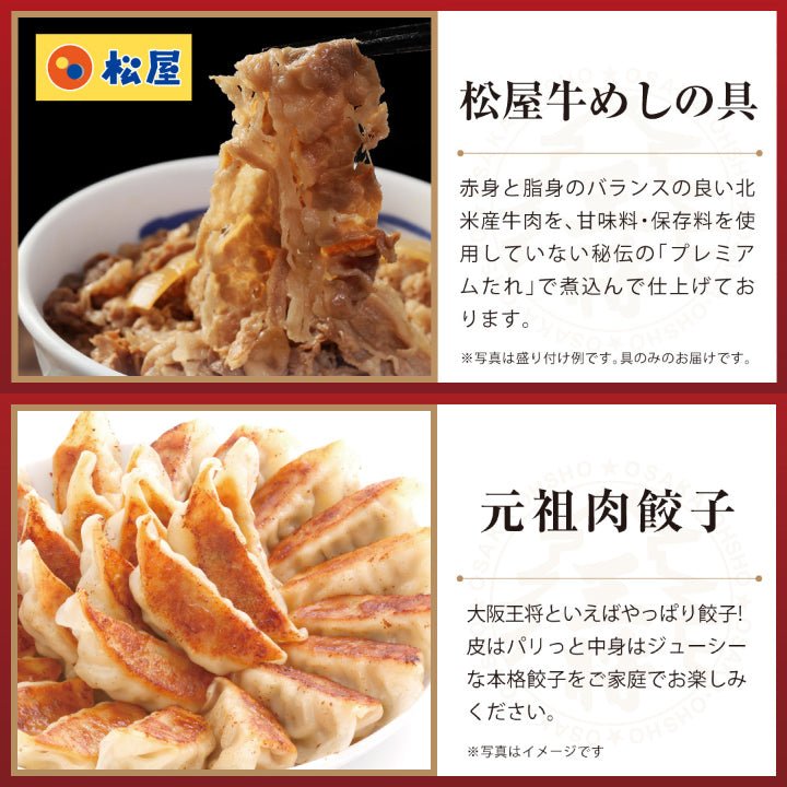 松屋牛めし、大阪王将の炒飯1種と元祖肉餃子の詰合せセットです。