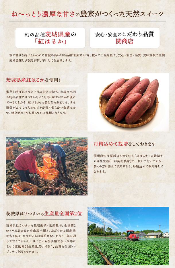 蜜芋と呼ばれるほど上品な甘さを持ち、市場に出回る既存品種のさつまいもよりも形・味ではるかに優れていることから「紅はるか」と名付けられました。また糖分がたっぷり入って甘みが強く柔らかい食感なので、焼き芋にとても適している品種となります。ひとつひとつ心を込めて丁寧に仕上げました。