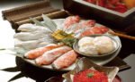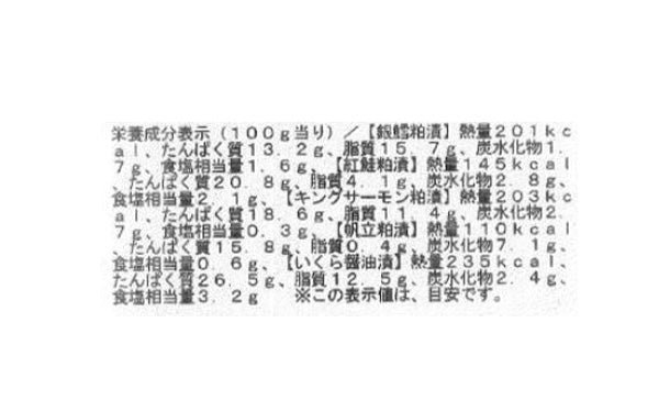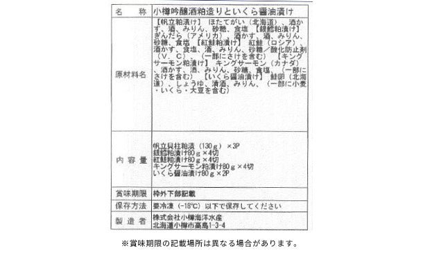 数種類の魚介を、北海道・小樽にある造り酒屋の吟醸酒の酒粕でじっくりと漬け込みんだ小樽吟醸酒粕造りと甘口でまろやかな仕上がりのいくら醬油漬けです。