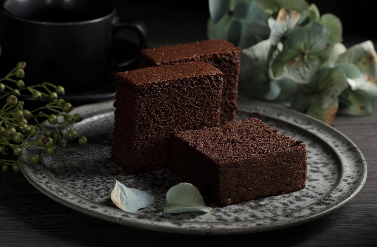 卵白と卵黄を別々に泡立てる別立て法を採用することでカカオの割合を極限まで高めました。濃厚なコク、しっとりとした食感、そしてカカオのほろ苦さと底に潜むザラメの甘み。五三焼カステラと肩を並べるまさにPremiumなチョコレートカステラです。