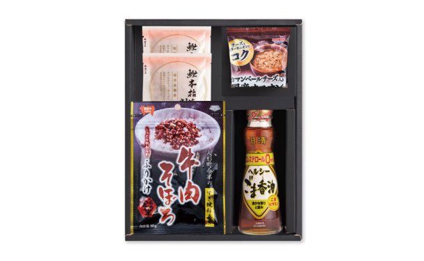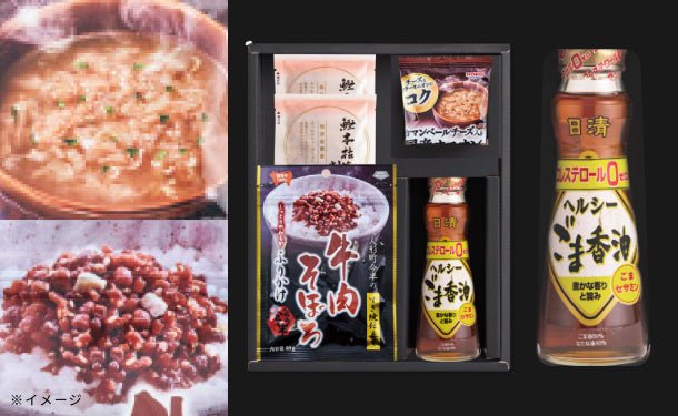 人形町今半の牛肉そぼろふりかけとオニオンスープ、日清ヘルシーごま香油、鰹節のセットです。