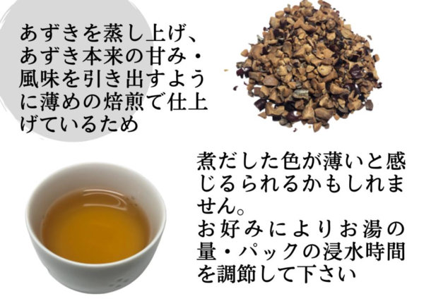 あずきの風味と香ばしさが口に広がりほっこり落ち着くやさしい飲みやすいお茶です。サポニンやポリフェノールなどの栄養を含む健康茶です。 ノンカフェインですので、妊婦さんやお子様にも安心。 簡単・お手軽にお飲みいただける ティーパックタイプです。