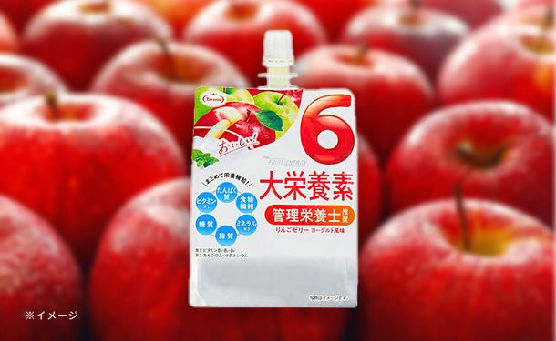 りんごヨーグルトの味わいで「おいしい!」を感じながら、6大栄養素(たんぱく質・糖質・脂質・ビタミン(※1)・ミネラル(※2)・食物繊維)を一度に摂ることができるパウチゼリーです。 赤りんご・青りんごのW果汁使用し、 甘酸っぱいりんごの果汁感にまろやかなヨーグルトの風味をプラスしました。 のど越しがよい、ぷるんと食感。毎日をおいしく健康にサポートします。
