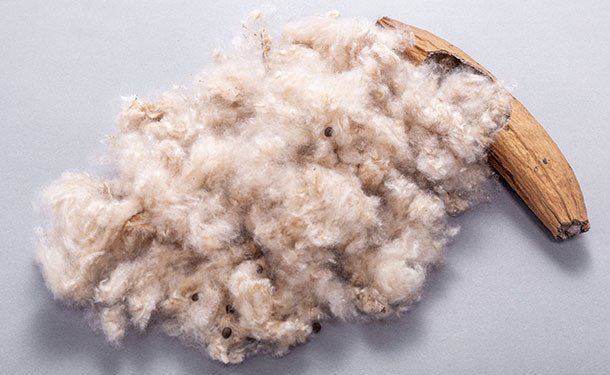 カポックは軽すぎて加工が難しいため、ダクロンΩ捲縮繊維(ポリエステル)と混ぜて作ったわたは高い機能性を持っています。