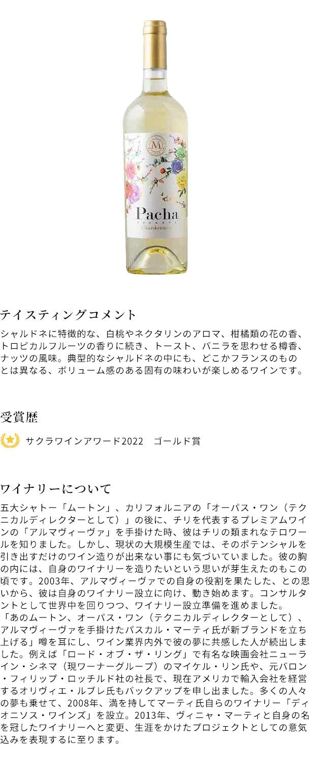 「ムートン・オーパス元醸造家が手掛けた白ワイン パチャ・シャルドネ」750ml