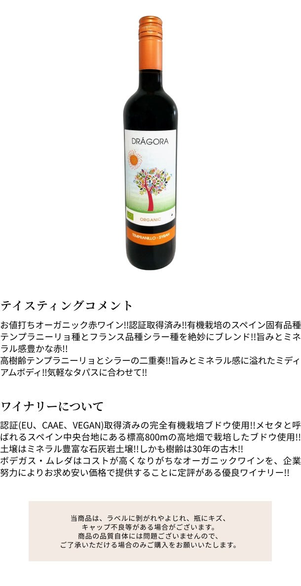 スペイン産 赤「ドラゴラ・オーガニック・テンプラニーリョ・シラー」750ml×12本