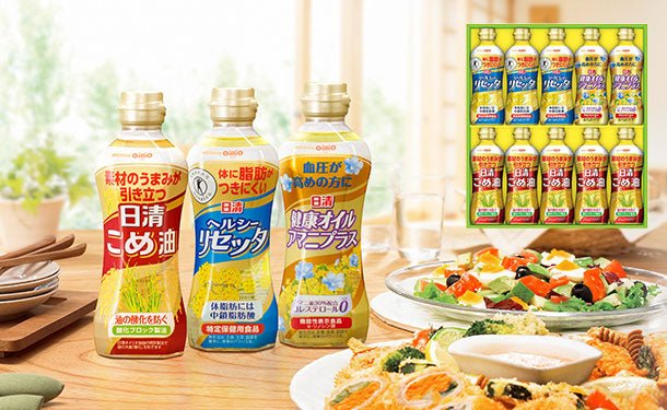 トクホの日清MCTリセッタ、機能性表示食品の日清健康オイルアマニプラスに、人気のこめ油を詰め合わせたギフト