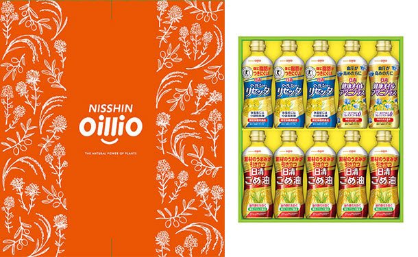 トクホの日清MCTリセッタ、機能性表示食品の日清健康オイルアマニプラスに、人気のこめ油を詰め合わせたギフト