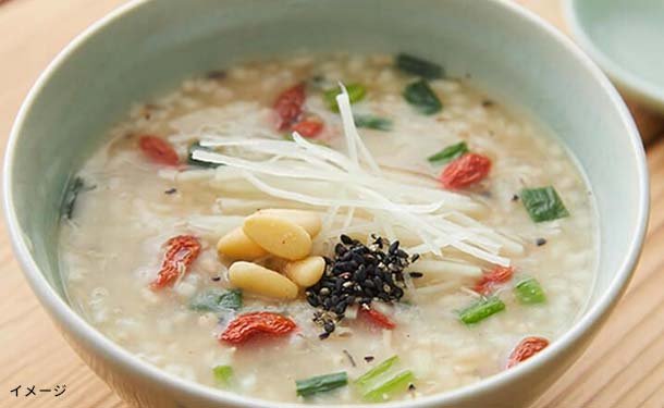濃厚なガラスープを使用しニラと生姜の風味を引き立て、薬膳粥のように仕立てました。食感をたのしめるお粥です。