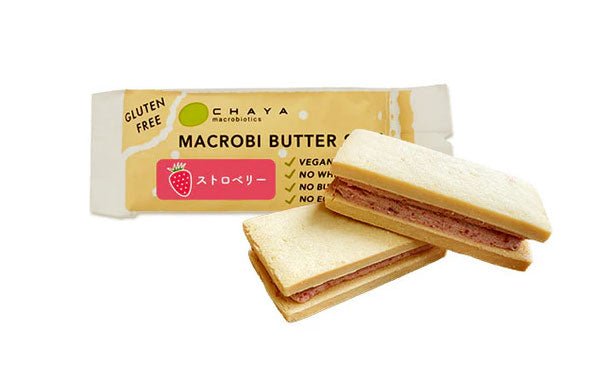 植物性の濃厚な「マクロビバター」にさわやかな甘みのストロベリーを、米粉と大豆粉を使用したグルテンフリーのクッキー生地にサンドしました。