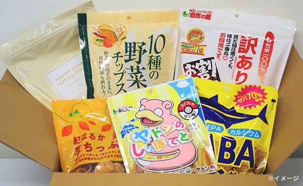 製造時にパッケージに傷がついて規格外になった商品や、需要の変化で販売先のない商品など、様々な原因でお困りのお菓子・おつまみをBOXにしました。