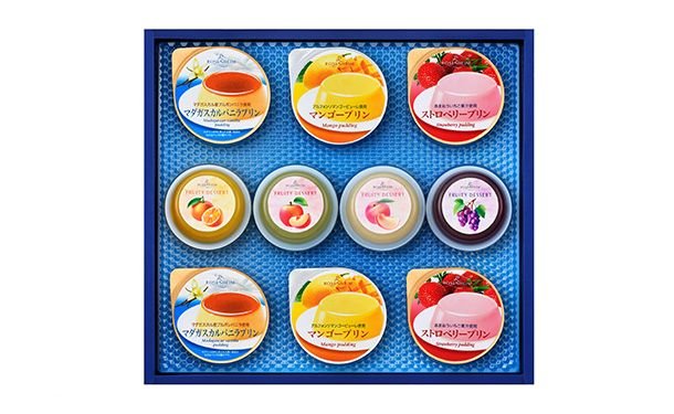 白桃・いよかん・ぶどう・りんごの4種類の国産果実のすりおろしゼリーと、マダガスカル産バニラ・マンゴー・あまおう苺のストロベリーの3種類のプリンのアソートセットです。