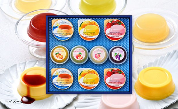 4種類の国産果実ゼリーと3種類のプリン詰め合わせ。