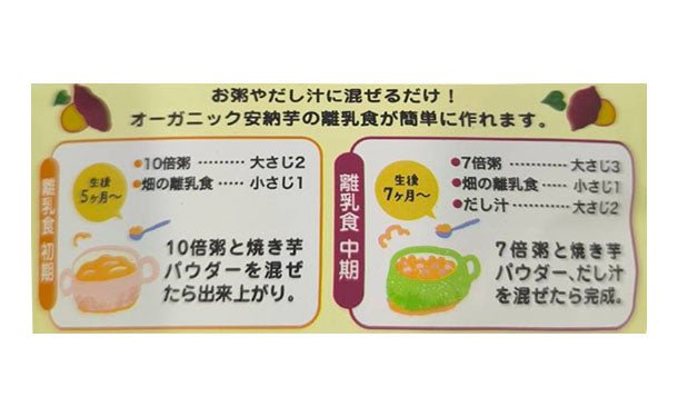 お粥やお出汁にスプーン1杯入れるだけで簡単に離乳食を作れます。 また、クッキーやパンケーキの材料に混ぜお芋の味をプラスできます。 さっと溶けるので牛乳やヨーグルトにも最適です。