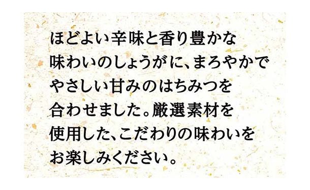 厳選素材を使用した本格派しょうがはちみつのど飴です。
