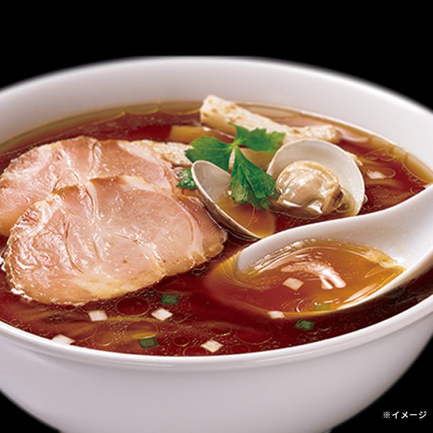 すっきりとしながらも芳醇に香る鶏油と、蛤の旨みが感じられるコク深い醤油スープです。「むぎとオリーブ」店主監修。