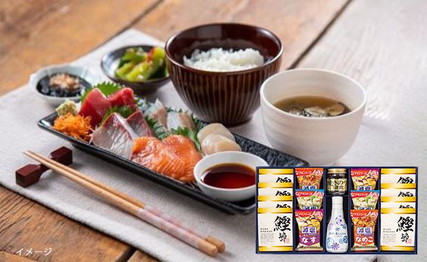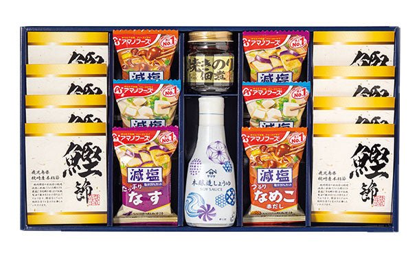 伝統的製法で手間暇かけて作り上げた鰹節の中でも高級品と位置付けられる本枯節や、とろっとしたなすの食感が楽しめるフリーズドライなどのギフトセットです。