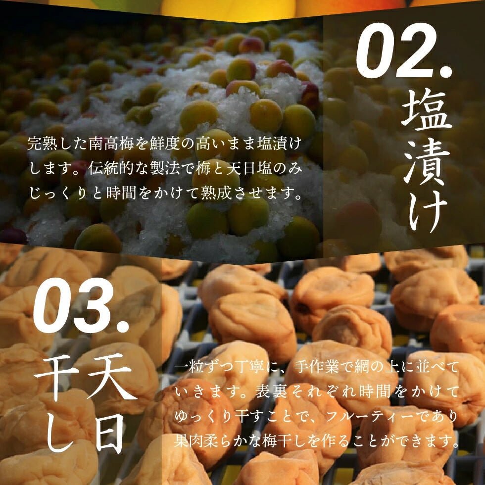 日本一の梅の産地「和歌山」で育まれた紀州産南高梅。完熟した実が自然に落下するまで待って収獲するため、フルーティで香りが高く、果肉が柔らかいのが特徴です。そのため梅干しの漬けこみやパック詰めの際に、どうしても皮が破れ果肉がつぶれてしまうものが出てきてしまいます。