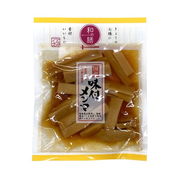 国産の孟宗筍をメンマの食感を出すよう乾燥し、それをじっくりと時間をかけて戻し、化学調味料を使用せず、粗糖、米発酵調味料、ごま油などで風味豊かに、歯ごたえよく仕上げた、味付メンマです。国産筍ならではの、シャキッとした特有の食感が美味しさを一層引き立てます。ラーメンや冷やし中華のトッピングに、酒の肴にご利用ください。