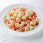 さまざまな料理に使用できる、じゃがいも・玉ねぎ・ にんじんのミックス品。 じゃがいもは約20mm、玉ねぎとにんじんは15mmのダイスカット。
