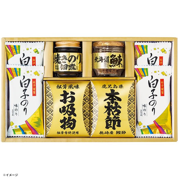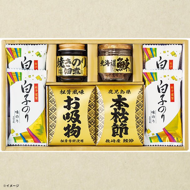 海苔及び海苔加工品のシェアは全国有数であるトップブランド白子のりの海苔、長い時間をかけて風味豊かに造り上げた鹿児島県枕崎産の鰹本枯節などの詰め合わせです。