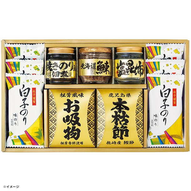 海苔及び海苔加工品のシェアは全国有数であるトップブランド白子のりの海苔、長い時間をかけて風味豊かに造り上げた鹿児島県枕崎産の鰹本枯節、国産原料を使用した小豆島製造の塩昆布などの詰め合わせです。