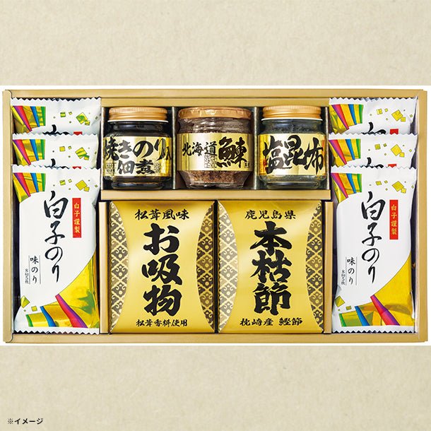 海苔及び海苔加工品のシェアは全国有数であるトップブランド白子のりの海苔、長い時間をかけて風味豊かに造り上げた鹿児島県枕崎産の鰹本枯節、国産原料を使用した小豆島製造の塩昆布などの詰め合わせです。