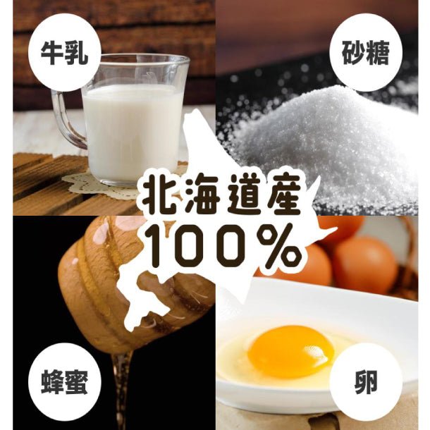 原材料の米粉は、自社製粉した北海道産ゆめぴりか100%米粉を使用、バター・砂糖・牛乳・蜂蜜・タマゴも北海道産を100%使用し、全て北海道にこだわりぬいた逸品です。