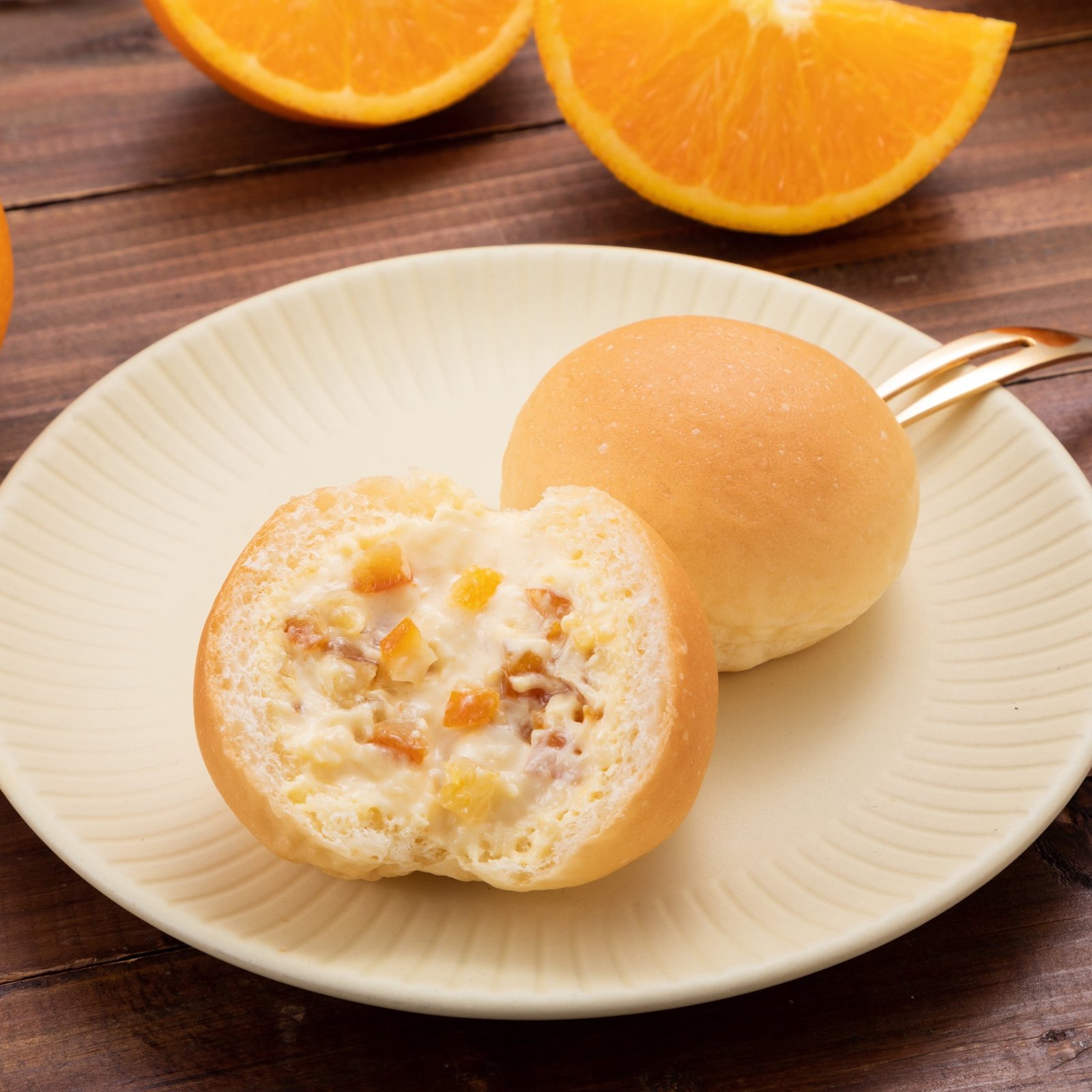 オレンジの爽やかな酸味とほのかな苦味のあるピューレと、濃厚なバレンシアオレンジピールの砂糖漬けをクリームに混ぜ込み、パンに注入しました。 一口食べるとオレンジの味と香りが口いっぱいに広がるミニくりーむパンです。