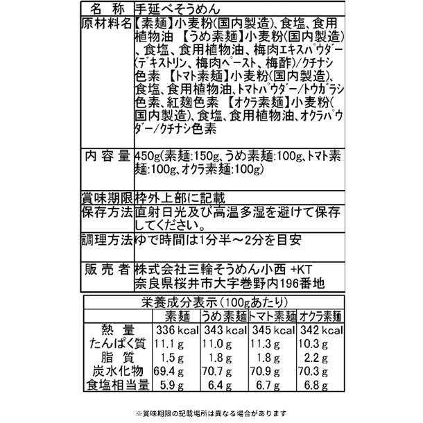 三輪素麺に、うめ・トマト・オクラの粉末を練り込み彩り豊かな麺に仕上げました。
