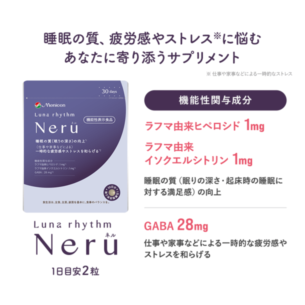 睡眠の質や、仕事や家事による一時的な疲労感やストレスに悩む方に寄り添う、ルナリズムシリーズから誕生した睡眠サポートサプリです。
