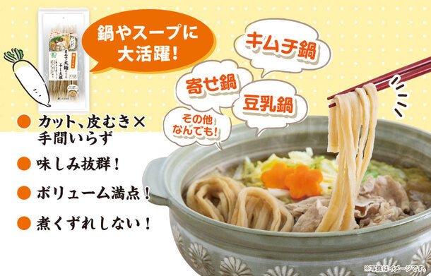 お鍋で煮込むとまるで太麺! 味しみ抜群で煮くずれしないので、お鍋やスープの具材にぴったりです。お好みの長さにカットしてはりはり漬けなどにも。