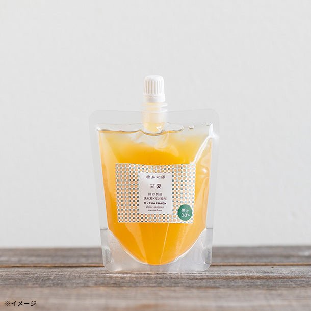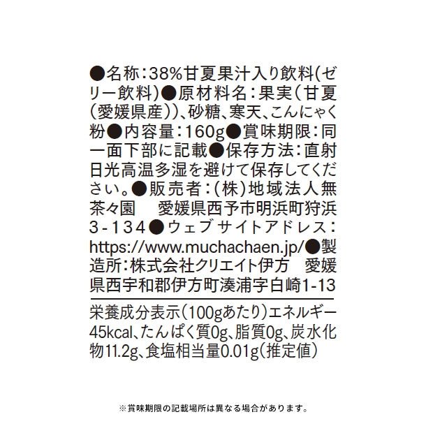 無茶々園産の柑橘果汁に、国産の粗糖、粉寒天、こんにゃく粉を加え、ゆるく固めた飲むゼリー。朝食やおやつに、ホームパーティや遠足にどうぞ。柑橘そのものの風味を生かすことにこだわりました。しっかりとした酸味を感じる「甘夏」。意外と糖度もあって味が濃いのも特徴です。しっかりと冷やしてからお召し上がりください。冷凍庫で3~4時間ほど凍らせてから、シャーベット状にして食べても美味しいです。
