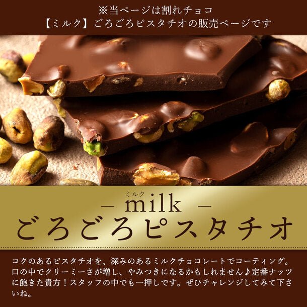 ピスタチオとクーベルチュールチョコレートの組み合わせがやみつきになる割れチョコです。