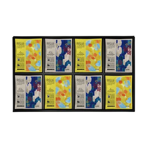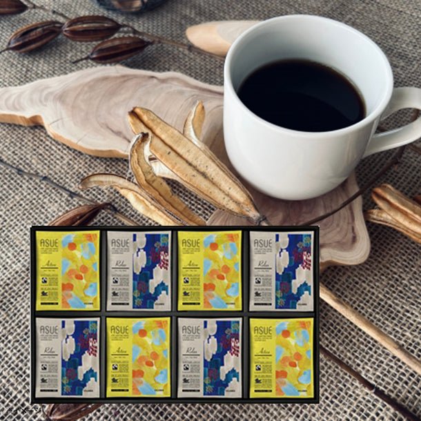 「一杯のコーヒーからできること」を体現した「ASUE Fairtrade Coffee」。Active、Relaxの2種類の味わいのブレンドを詰め合わせたドリップコーヒーセットです。