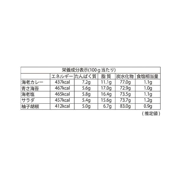 磯の香りひろがる青さ煎餅と、柚子が香るスパイシーな柚子胡椒煎餅、海老とカレーが癖になる海老カレー煎餅、サクッとソフトなサラダ煎餅、焼き上げた海老が香ばしい厚焼きの海老煎餅の詰合せです。