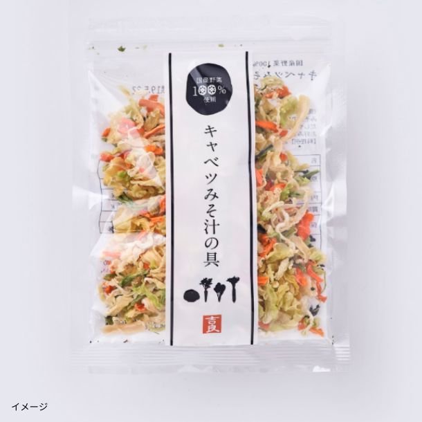 主に九州産の野菜(キャベツ、人参、小松菜、大根)を熱風乾燥してブレンドしました。お味噌汁を作る時は、水の状態から具を入れて下さい。熱湯で戻す場合は約5分かかります。みそ汁以外にも和え物、サラダ、炒め物として活用いただけます。