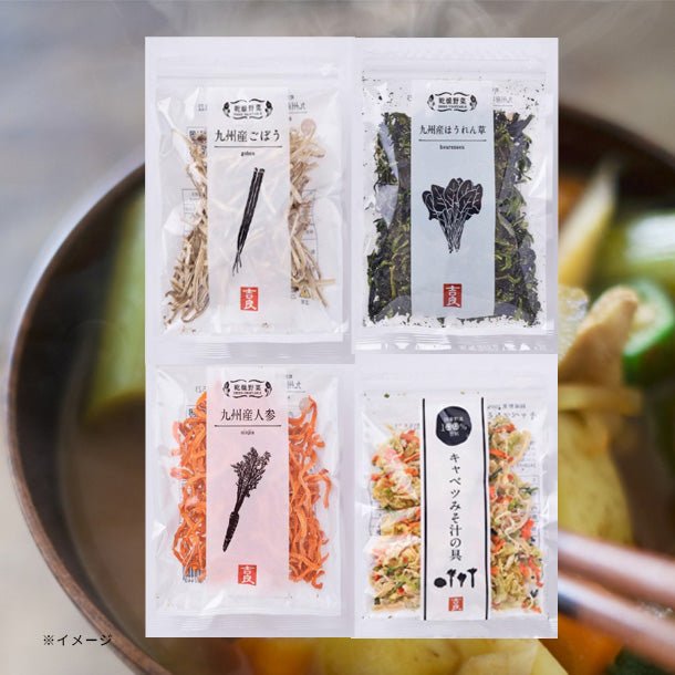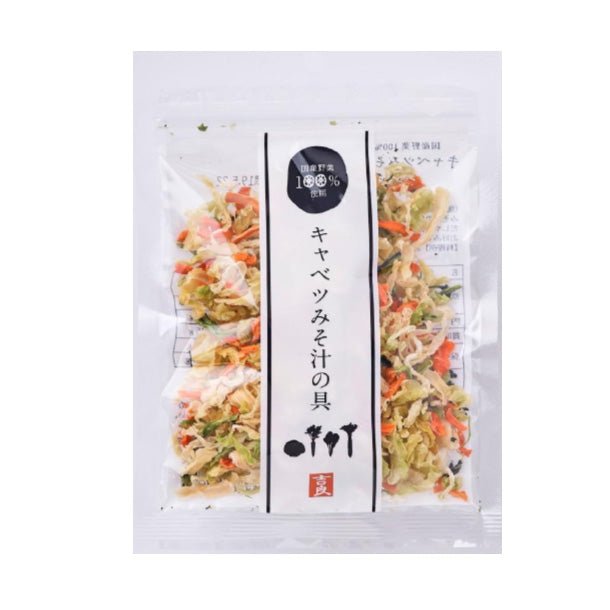 主に九州産の野菜(キャベツ、人参、小松菜、大根)を熱風乾燥してブレンドしました。お味噌汁を作る時は、水の状態から具を入れて下さい。熱湯で戻す場合は約5分かかります。みそ汁以外にも和え物、サラダ、炒め物として活用いただけます。