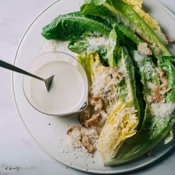 Tips:シンプルにミニロメインレタスにかけ、仕上げにクルトン、ブラックペッパー、パルメザンチーズをひと振り。
